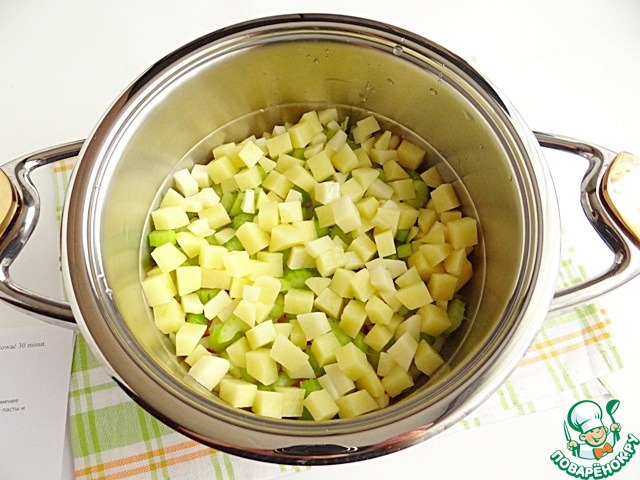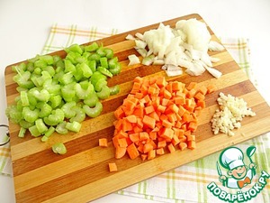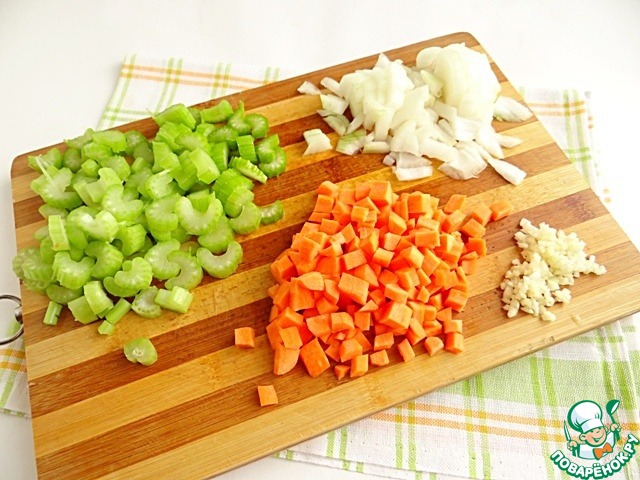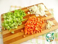 Овощи мою и нарезаю - репчатый лук и морковь кубиками, сельдерей небольшими кусочками, чеснок мелко режу ножом.
