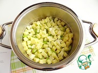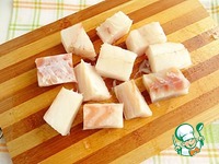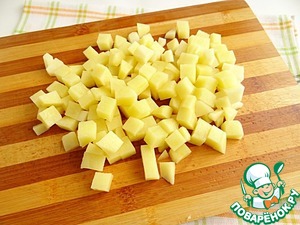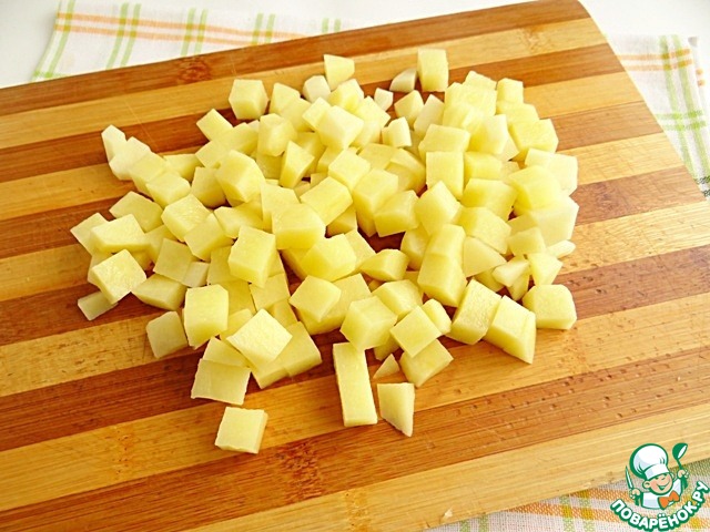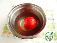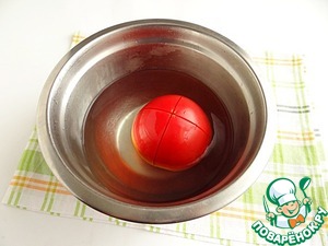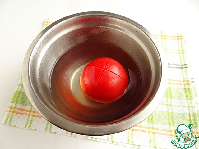 Крупный помидор надрезаю крестообразно ножом, обдаю кипятком. Снимаю шкурку. Помидор тоже нарезаю кубиками.