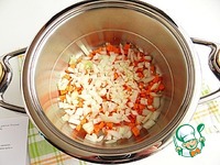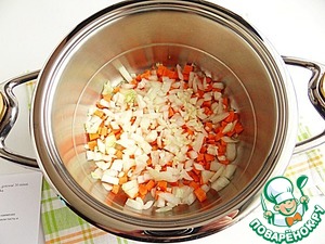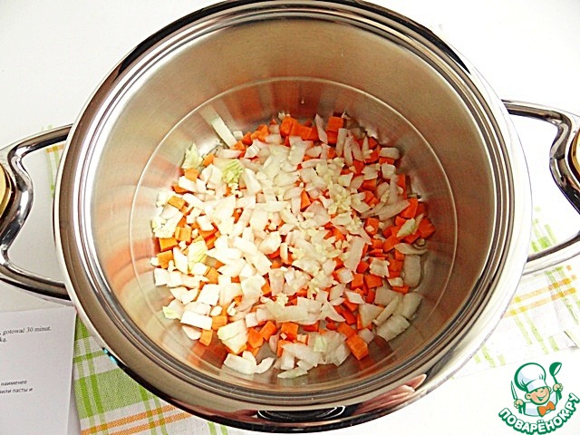 Для приготовления супа я использую кастрюлю Zepter на 3 литра. Выкладываю морковь, затем лук и чеснок.