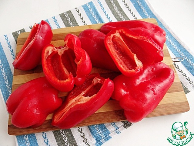 Перцы разрезаю пополам, удаляю семена и плодоножки, мою.