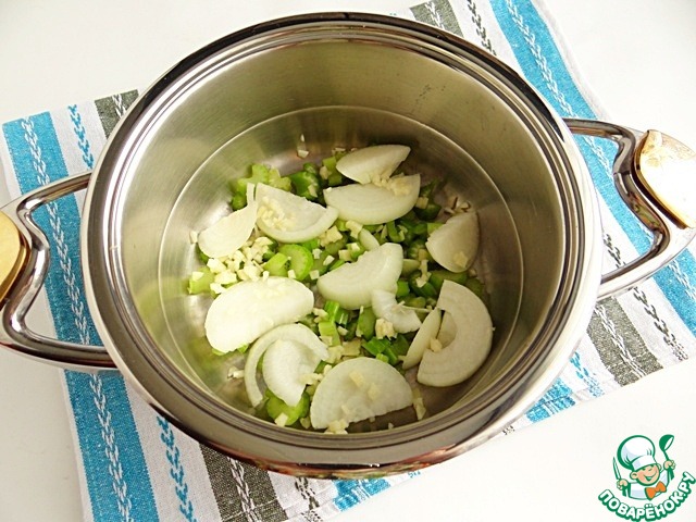 В кастрюлю Zepter (я использую кастрюлю на 3 литра) выкладываю сначала сельдерей, затем репчатый лук, чеснок.