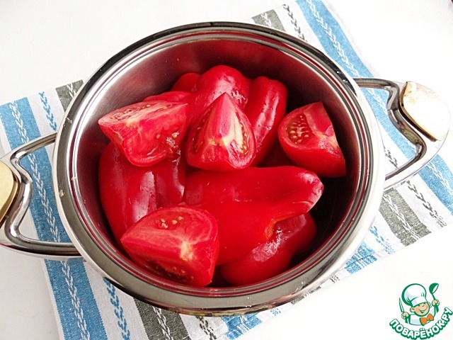 Снимаю кожуру с перцев и помидора (вынимаю перцы и четвертинки помидора в широкую миску, чуть даю им остыть, тогда уже снимаю с них пленку).