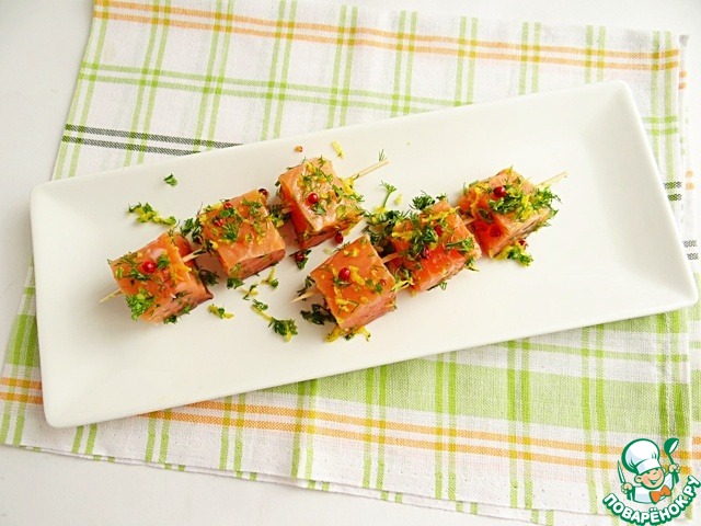 Вот так выглядит маринованный лосось, приготовленный на шпажках.