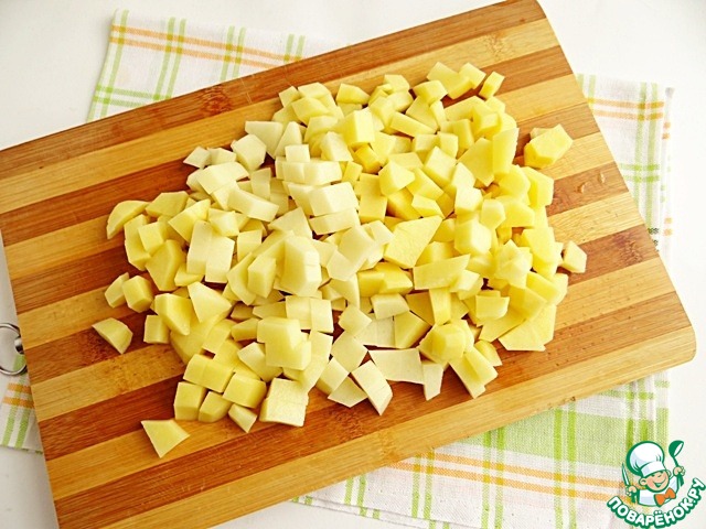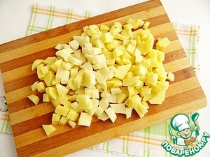 Лосось нарезаю кубиками на 6 или 8 частей.