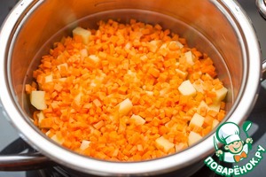 В холодную кастрюлю кладем слоями - картофель кубиками, морковь