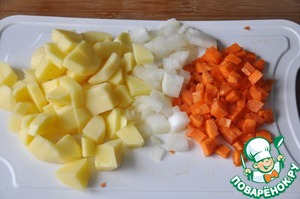 Овощи моем, чистим, кубиками режем лук, морковь и картофель.