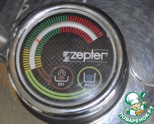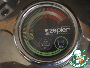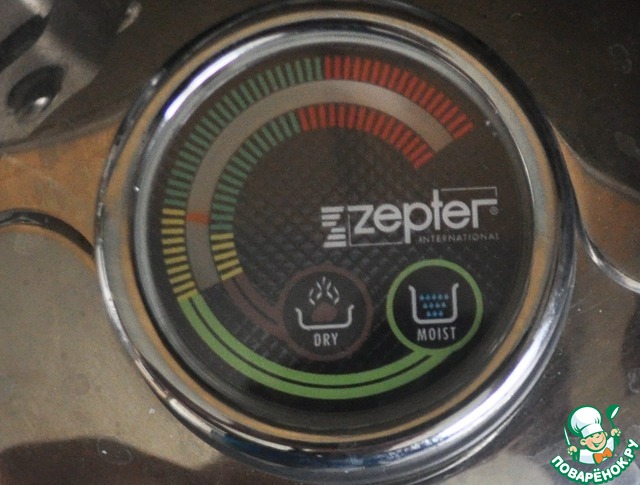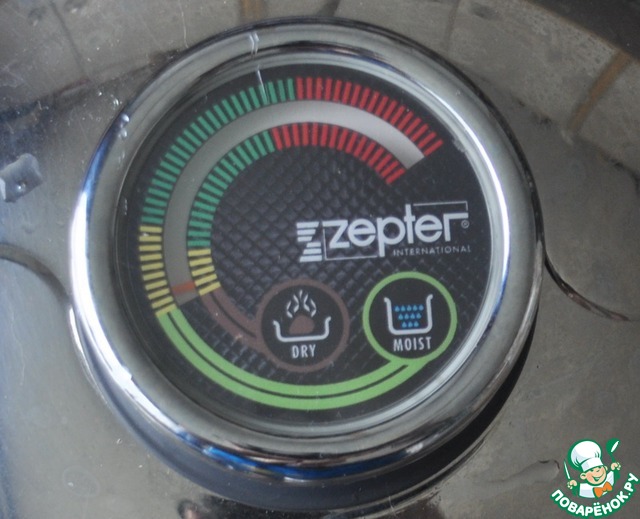 Медленно доводим стрелку термоконтроллера на крышке до начала зелёной зоны. Убираем огонь до минимального - 1-е деление из 6.