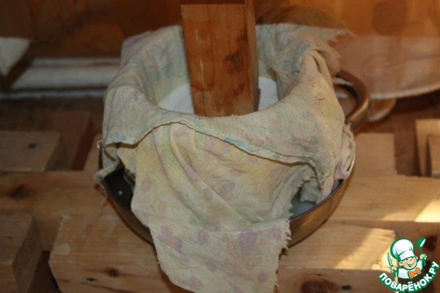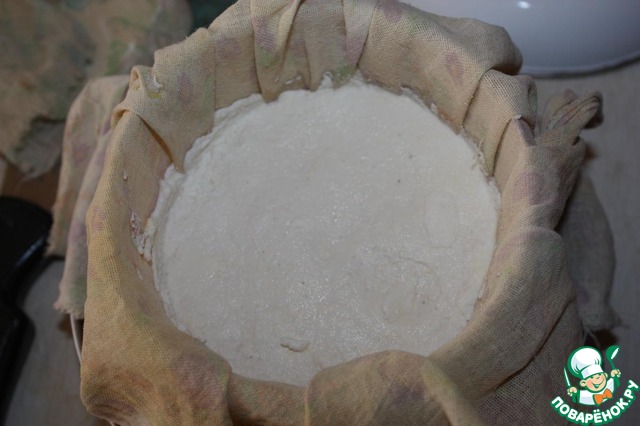 Сначала надо из подсырной сыворотки приготовить рикотту. На "Поваренке" есть несколько вариантов приготовления рикотты. Я рекомендую http://www.povarenok .ru/recipes/show/991 33/. Готовую рикотту выложить в форму, выложенную сырной тканью.