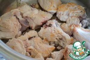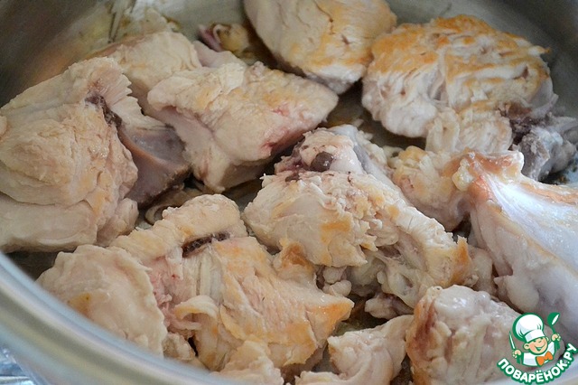 Приступаем к приготовлению мяса. Мясо мы обжариваем без масла. Нарезаем и обжариваем в разогретой кастрюле курицу. Кладем ее на сухое дно, через несколько секунд переворачиваем - образуется корочка.
