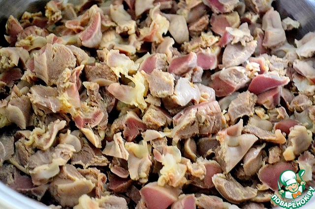 Остывшие желудки откидываем на дуршлаг, нарезаем на кусочки. -