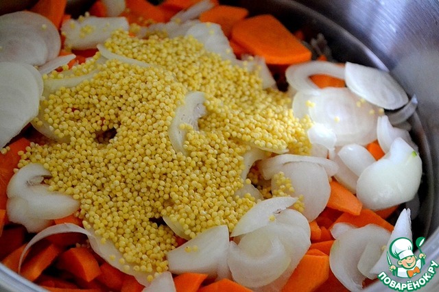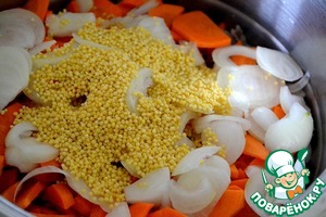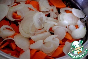 Желудки кладем на дно кастрюли, сверху - овощи. Закрываем кастрюлю и на среднем огне прогреваем овощи около 5-7 минут