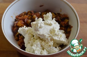 Когда овощи будут полностью готовы, то перекладываем их в миску, добавляем прям в горячие овощи творог и пюрируем погружным блендером до однородного состояния.
