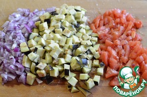 Лук, баклажан и помидор порезать маленькими кубиками.