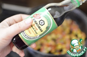 Во время жарки добавить 1 столовую ложку соевого соуса Киккоман и любимые специи ( у меня молотый красный острый перец) -