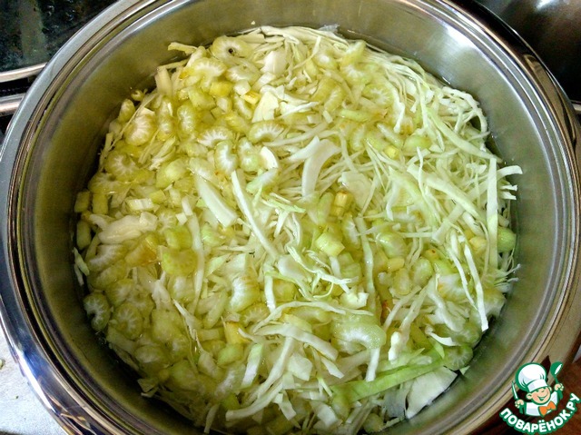Складываем в кастрюлю Zepter капусту и сельдерей, ставим на огонь меньше среднего. Накрываем крышкой, как только стрелка термоконтроллера подошла к началу зеленого поля, уменьшаем газ до минимума и томим овощи 10 минут.