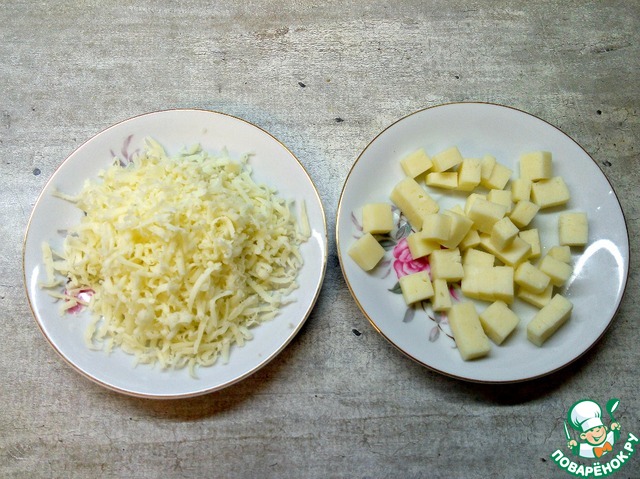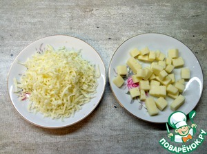 Половину сыра порезать мелким кубиком, половину натереть на терке.