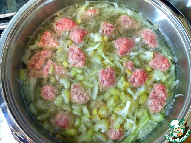 Через 10 минут овощи пустили сок (капуста у меня была рыхлая и очень сочная). Приминаем ложкой овощи ко дну и добавляем фарш в суп. Я добавляла чайной ложечкой, этакие фрикадельки получились. Накрыть крышкой и готовить еще 15 минут.