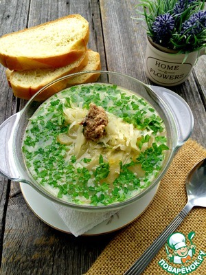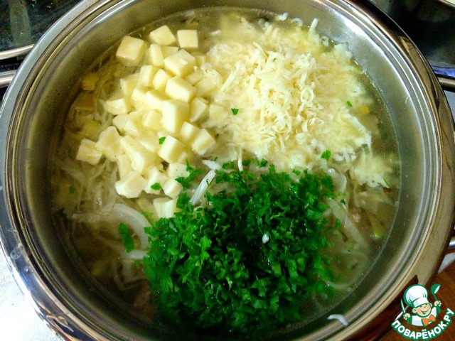 По истечении 15 минут выключить огонь, добавить в суп сыр, мелко нарезанную петрушку. Тщательно перемешать, чтобы сыр не слипся в один кусок. Суп получается густой, доливаем горячую кипяченную воду до желаемой консистенции. Оставить еще на 10 минут настояться.