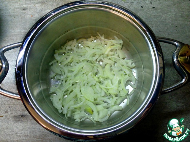 Лук режем полукольцами, укладываем на дно кастрюли Zepter.