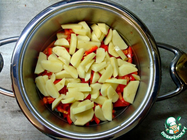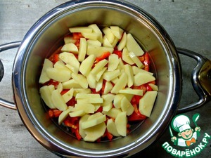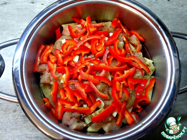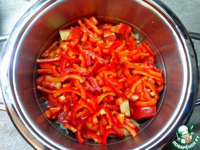 Последним слоем будет оставшийся болгарский перец. Ничего больше добавлять не надо - ни воды, ни масла, ни соли. Накрываем крышкой, ставим на самый минимальный огонь и оставляем на час.