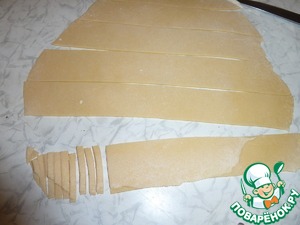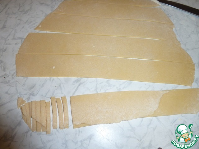 Затем разрезаем пласт теста на полоски шириной около 4см, после чего каждую полоску режем на "лапшичку" шириной 3-5мм (для быстроты процесса я кладу несколько полосок одну на одну и режу, ничего страшного если "лапшичка" немного склеится). Аналогично поступаем с оставшимся тестом и получаем кучку "лапшички"