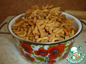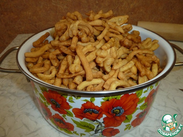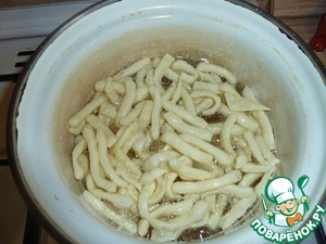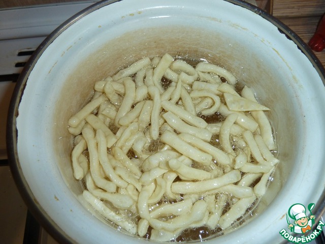 Наливаем растительное масло в кастрюльку (фритюрницу), масла должно быть много, хорошенько его разогреваем и очень осторожно!!! бросаем в него немного нашей "лапшички" сразу перемешиваем, если масло хорошо раскалено, то она сразу заметно увеличится в размере.