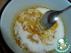 Теперь приступим к подготовке заливки. В маленькую кастрюльку или ковшик выкладываем мед и сахар, перемешиваем и ставим на огонь