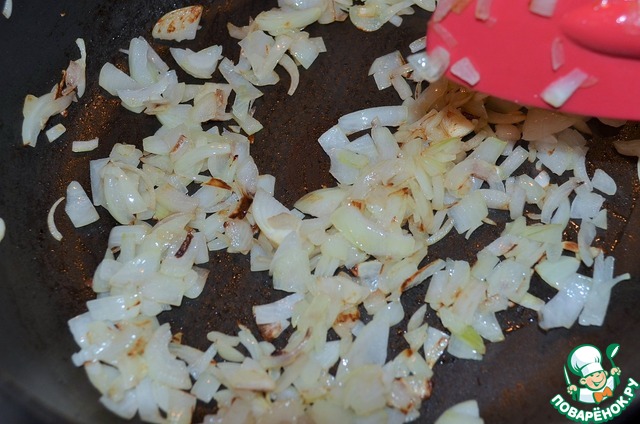 Обжарить лук на растительном масле, удобнее это сделать в глубокой сковороде.