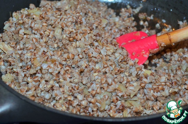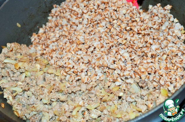 Выложить к фаршу сваренную гречневую кашу.