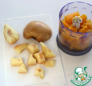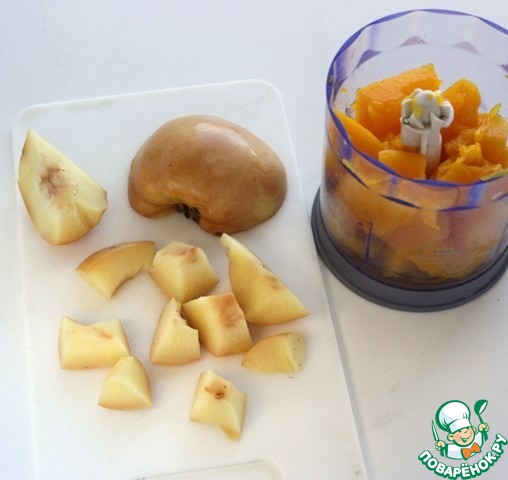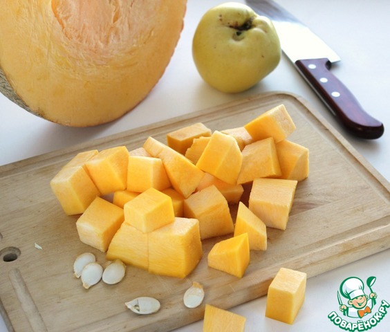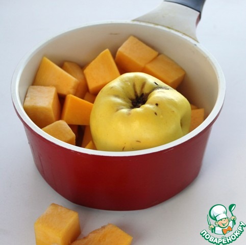 Кусочки тыквы и айву отварить в кипящей воде до готовности тыквы. На это уйдет минут 10. Воду слить