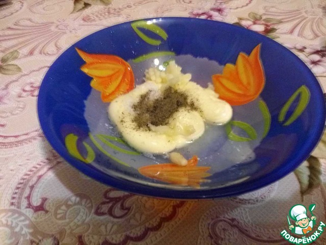 в майонез высыпаем 2/3 чайной ложки соли, выдавливаем дольку лимона (нужен только сок), выдавливаем чеснок через чеснокодавку, перчим. (можно и другие пряности использовать, главное чтобы для курицы и духовки подходили)