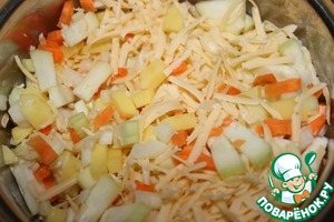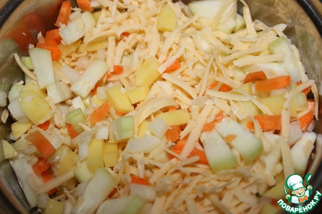 Нарезать небольшими кусочками и добавить тертый сыр.