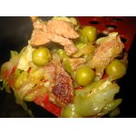 3. Выложить мясо на лук с перцем, перемешать и готовить, помешивая, пока мясо со всех сторон не изменит цвет и не пустит сок.