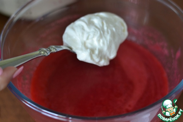 Одну ложку маскарпонового крема аккуратно вмешать к малиновому пюре.