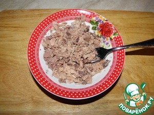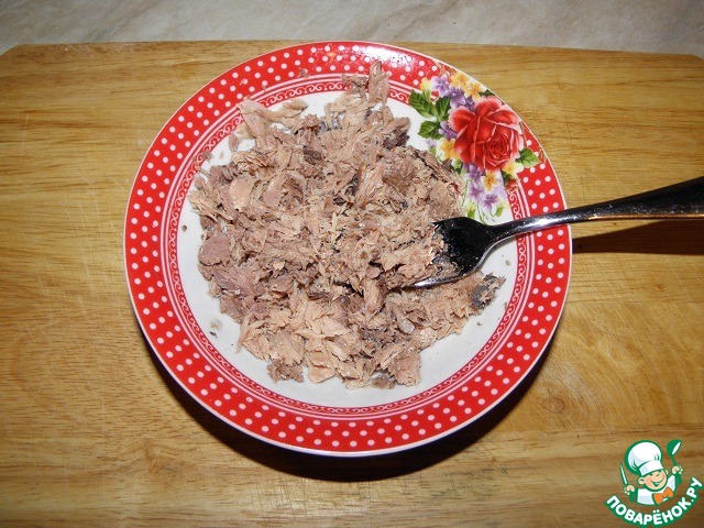 Мясо тунца отделить от жидкости, чуть размять вилкой.