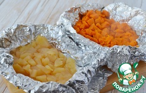 Тыкву и яблоки порезать небольшими кусочками, яблоки сбрызнуть лимонным соком, сложить в фольгу по отдельности яблоки и тыкву, завернуть и запечь при 220 градусов до мягкости... яблоки минут 15, а тыкву минут 25-30... смотрите по своей духовке. Охладить. Желатин замочить в кипяченой, охлажденной воде.
