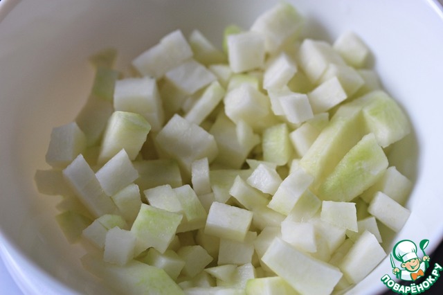 Кольраби вымыть, очистить и нарезать на небольшие кубики.