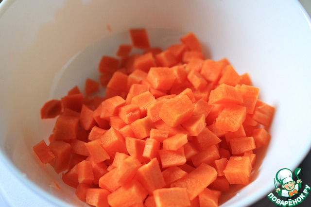 Морковь вымыть, очистить и нарезать на небольшие кубики.