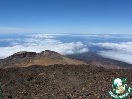Дышать там, правда, тяжело, воздух разреженный, давление от "земного" отличается, да и довольно прохладно, несмотря на близость к солнцу. Этого мы как раз и не учли, обгорели и обзавелись, так сказать, корочкой, по примеру этого блюда) Но вид с такой невообразимой высоты того стоил! Красота невероятная: стоять выше облаков, над головой бесконечная синева неба, под ногами вулкан, до земли почти 4 км, а в самом низу едва различимые волны океана...