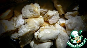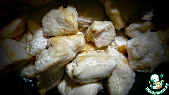 Куриное филе нарезается на небольшие кусочки и обжаривается в оливковом масле вместе с измельченным чесноком.