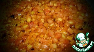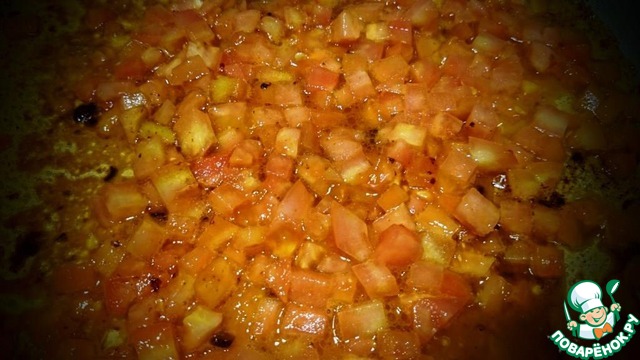 Пассирурются мелко нарезанные кусочки помидора, к которым добавляется шафран.