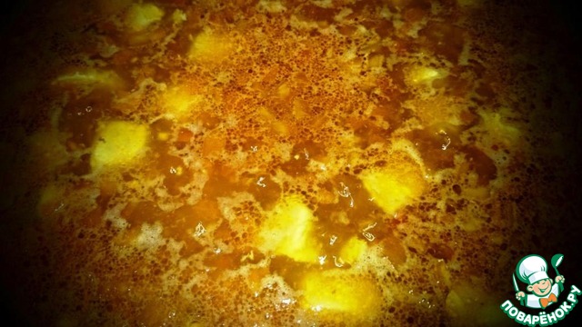 Далее содержимое сковороды перекладывается в кастрюлю, заливается водой, с добавлением соли варится около 30 минут. Данный шаг можно опустить, если у Вас имеется в наличии готовый куриный бульон.