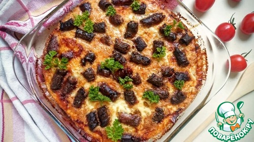На данном этапе, если сковорода позволяет, разложить колбаски поверх риса, залить взбитыми яйцами и сразу отправить в разогретую до 200 градусов духовку, пока на поверхности не образуется корочка. У меня такой сковороды нет, поэтому перекладываю содержимое сковороды в форму для запекания и далее - то же самое.