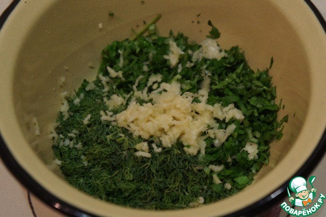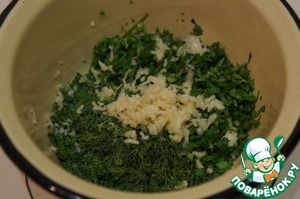 Тем временем мелко нарезать зелень: укроп, петрушку, кинзу, базилик, эстрагон. Состав зависит только от вашего вкуса.