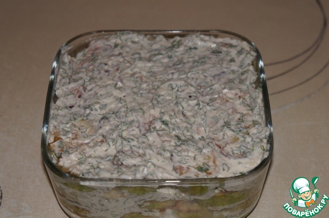 Накрыть еще одним слоем кабачком и снова смазать соусом.
