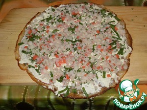 Утром приступаем к приготовлению закуски. Сырки, хрен с лимоном, сметану и майонез тщательно растереть до однородного состояния. Зелень и крабовые палочки мелко нарезать. Каждый, припрятанный накануне, блинчик смазать получившейся смесью. Посыпать зеленью.