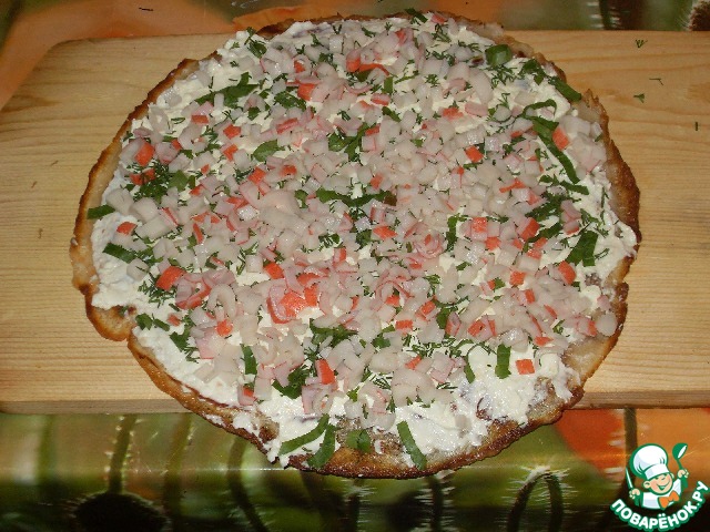 Затем равномерно посыпать крабовыми палочками.