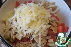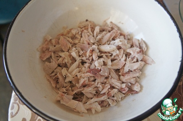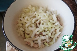 Отварить грибы и филе, нарезать соломкой. Я использовала консервированные шампиньоны, они мало отличаются от свежих отваренных.