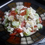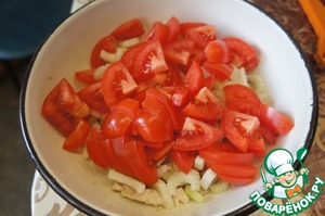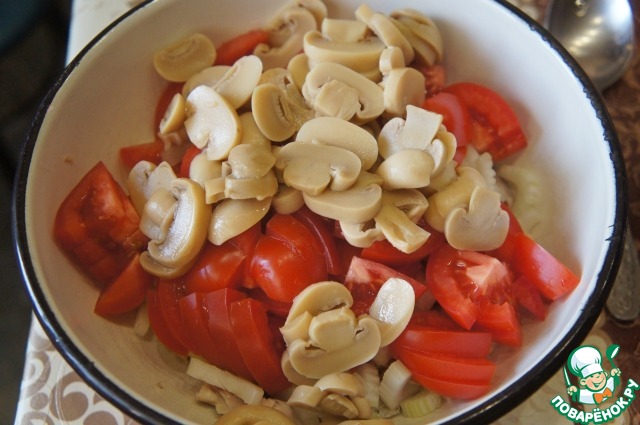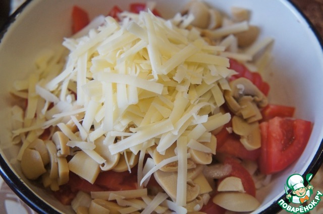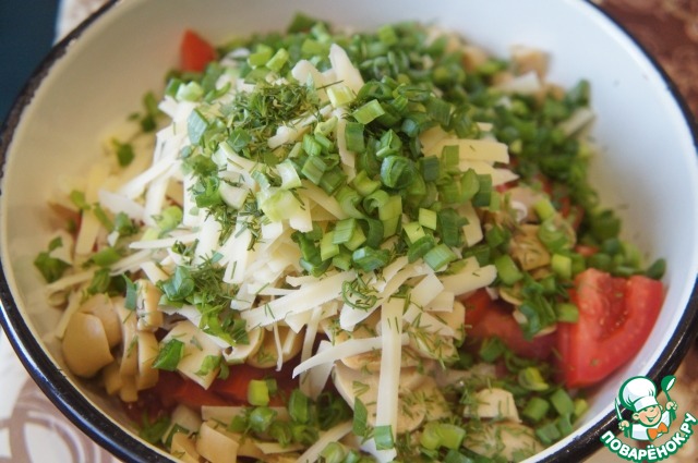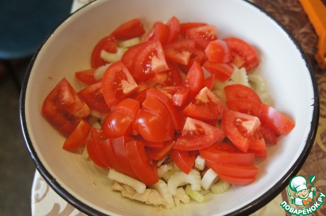 Вообще-то для подачи требуется выложить салат на блюдо горочкой, а вокруг салата разложить половинки кружочков помидора в виде лепестков цветка и между ними листики петрушки или укропа. Но мне захотелось замешать помидоры в общую массу. Для большей сочности.