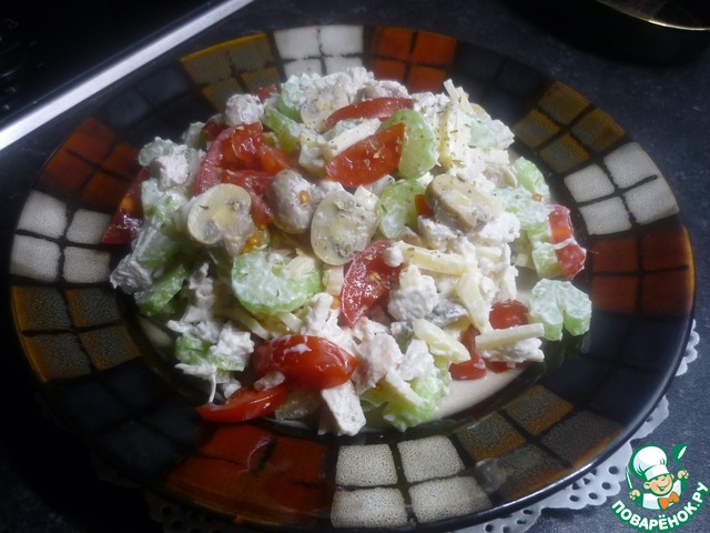 Салатик одновременно и сытный, благодаря курице, грибам и сыру, и свежий, чему способствует сельдерей. А отсутствие картошки делает его не слишком тяжелым.